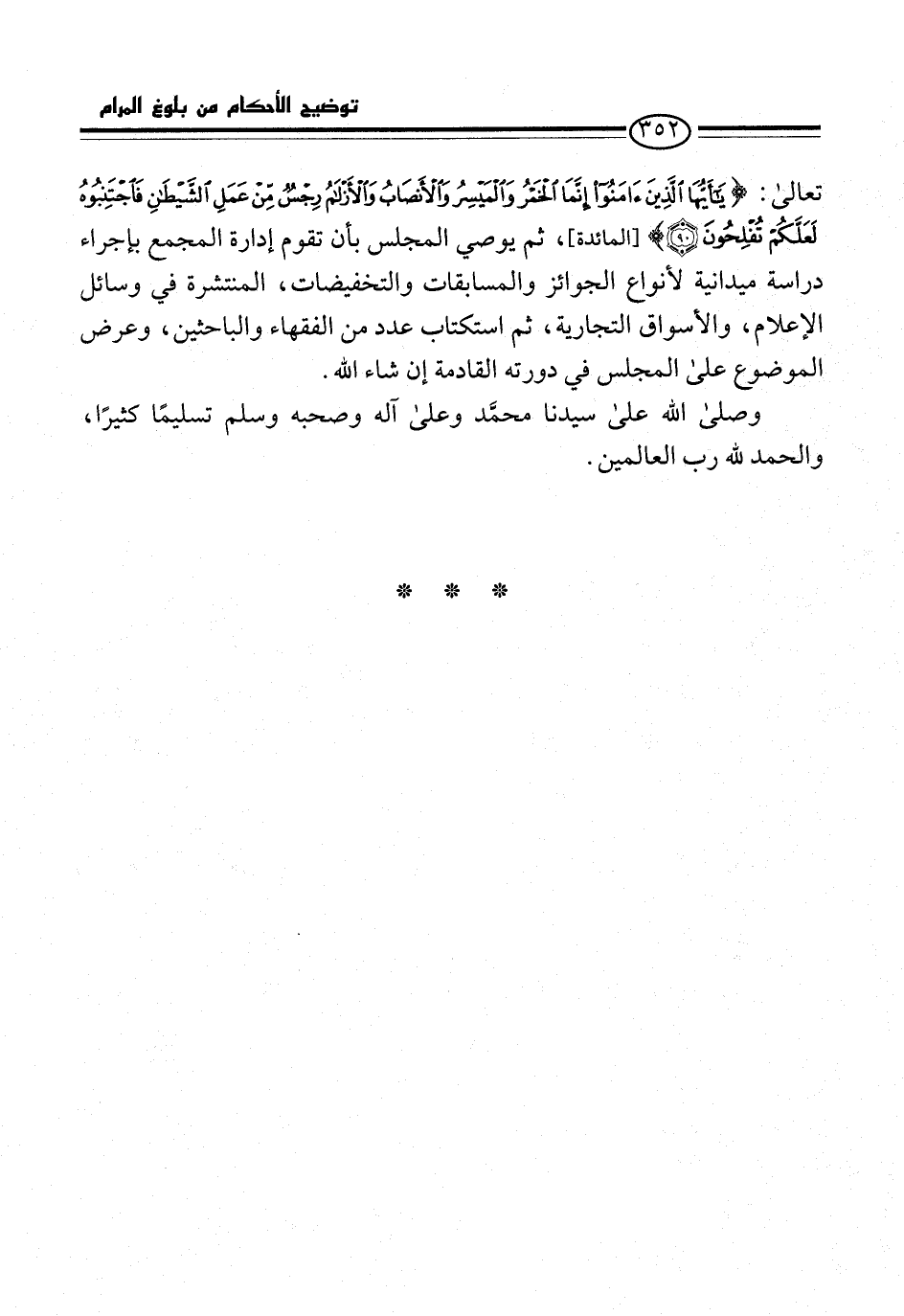 تعالى: {يَاأَيُّهَا الَّذِينَ آمَنُوا إِنَّمَا الْخَمْرُ وَالْمَيْسِرُ وَالْأَنْصَابُ وَالْأَزْلَامُ رِجْسٌ مِنْ عَمَلِ الشَّيْطَانِ فَاجْتَنِبُوهُ لَعَلَّكُمْ تُفْلِحُونَ (90)} [المائدة] ثم يوصي المجلس بأن تقوم إدارة المجمع بإجراء دراسة ميدانية لأنواع الجوائز والمسابقات والتخفيضات، المنتشرة في وسائل الإعلام، والأسواق التجارية، ثم استكتاب عدد من الفقهاء والباحثين، وعرض الموضوع على المجلس في دورته القادمة إن شاء الله.