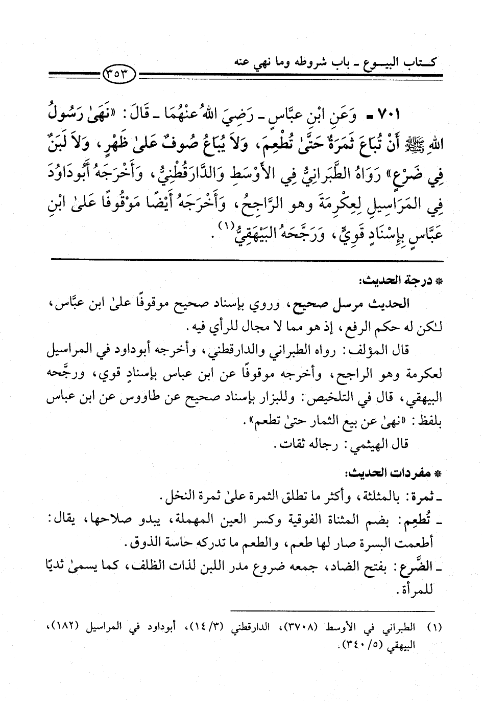 701 - وَعَنِ ابْنِ عبَّاسٍ -رَضِيَ اللهُ عنْهُمَا- قَالَ: "نَهَى رَسُولُ اللهِ -صلى الله عليه وسلم- أنْ تُبَاعَ ثَمَرَةٌ حَتَّى تُطْعِمَ، وَلاَ يُبَاعُ صُوفٌ عَلى ظَهْرٍ، وَلاَ لَبَنٌ فِي ضَرْعٍ" رَوَاهُ الطَّبَرانِيُّ فِي الأوْسَطِ وَالدَّارَقُطْنِيُّ، وَأَخْرَجَهُ أَبُو دَاوُدَ فِي المَرَاسِيلِ لِعِكْرِمَةَ وهو الرَّاجِحُ، وَأَخْرَجَهُ أَيْضًا مَوْقُوفًا عَلى ابْنِ عَبَّاسٍ بِإِسْنَادٍ قَوِيٍّ، وَرَجَّحَهُ البَيْهَقِيُّ (¬1).
