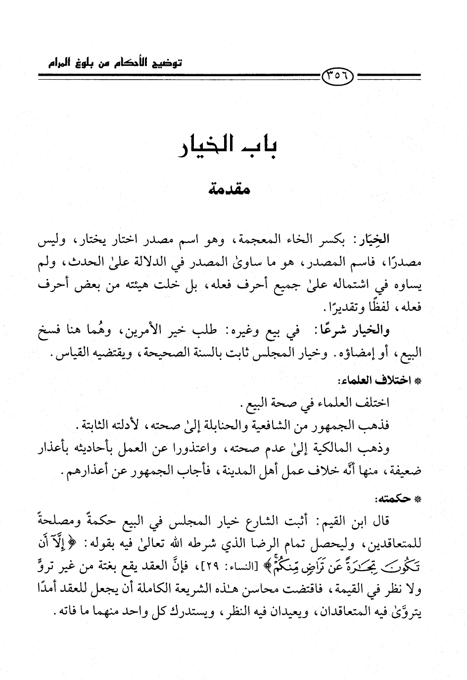 والخيار شرعًا: في بيع وغيره: طلب خير الأمرين، وهُما هنا فسخ البيع، أو إمضاؤه. وخيار المجلس ثابت بالسنة الصحيحة، ويقتضيه القياس.
