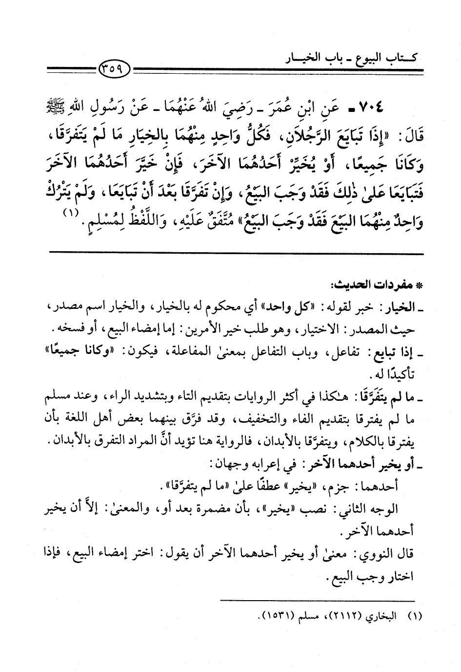 704 - عَنِ ابْنِ عُمَرَ -رَضِيَ اللهُ عَنْهُمَا- عَنْ رَسُولِ اللهِ -صلى الله عليه وسلم- قَالَ: "إِذَا تَبَايَعَ الرَّجُلاَنِ، فَكُلُّ وَاحِدٍ مِنْهُمَا بِالخِيَارِ مَا لَمْ يَتَفرَّقَا، وَكَانَا جَمِيعًا، أوْ يُخَيِّرْ أَحَدُهُمَا الآخَرَ، فَإِنْ خَيَّرَ أحَدُهُمَا الآخَرَ فَتَبَايَعَا عَلى ذلِكَ فَقَدْ وَجَبَ البَيْعُ، وَإِنْ تَفَرَّقَا بَعْدَ أنْ تَبَايَعَا، وَلَمْ يَتْرُكْ وَاحِدٌ مِنْهُمَا البَيْعَ فَقَدْ وَجَبَ البَيْعُ" مُتَّفَقٌ عَلَيْهِ، وَاللَّفْظُ لِمُسْلِمٍ. (¬1)