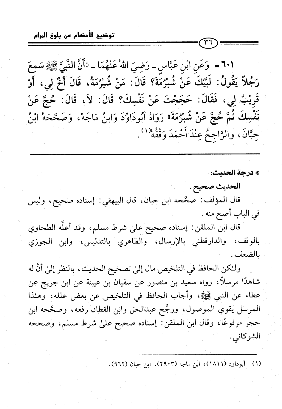 601 - وَعَنِ ابْنِ عَبَّاسٍ -رَضِيَ اللهُ عَنْهُمَا- "أَنَّ النَّبِيَّ -صلى الله عليه وسلم- سَمِعَ رَجُلًا يَقُولُ: لَبَيْكَ عَنْ شُبْرُمَةَ؟ قَالَ: مَنْ شُبْرُمَةُ، قَالَ أَخٌ لِي، أَوْ قَرِيْبٌ لِي، فَقَالَ: حَجَجْتَ عَنْ نَفْسِكَ؟ قَالَ: لَا، قَالَ: حُجَّ عَنْ نَفْسِكَ ثُمَّ حُجَّ عَنْ شُبْرُمَةَ" رَوَاهُ أبُو دَاوُدَ وَابنُ مَاجَهْ، وَصَحَّحَهُ ابْنُ حِبَّانَ، والرَّاجِحُ عِنْدَ أَحْمَدَ وَقْفُهُ (¬1).