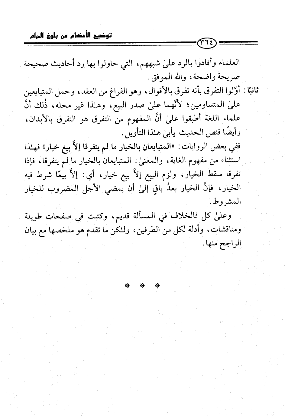 ثانيًا: أوَّدوا التفرق بأنه تفرق بالأقوال، وهو الفراغ من العقد، وحمل المتبايعين على المتساومين. لأنَّهما على صدر البيع، وهذا غير محله، ذلك أنَّ علماء اللغة أطبقوا على أنَّ المفهوم من التفرق هو التفرق بالأبدان، وأيضًا فنص الحديث يأبى هذا التأويل.