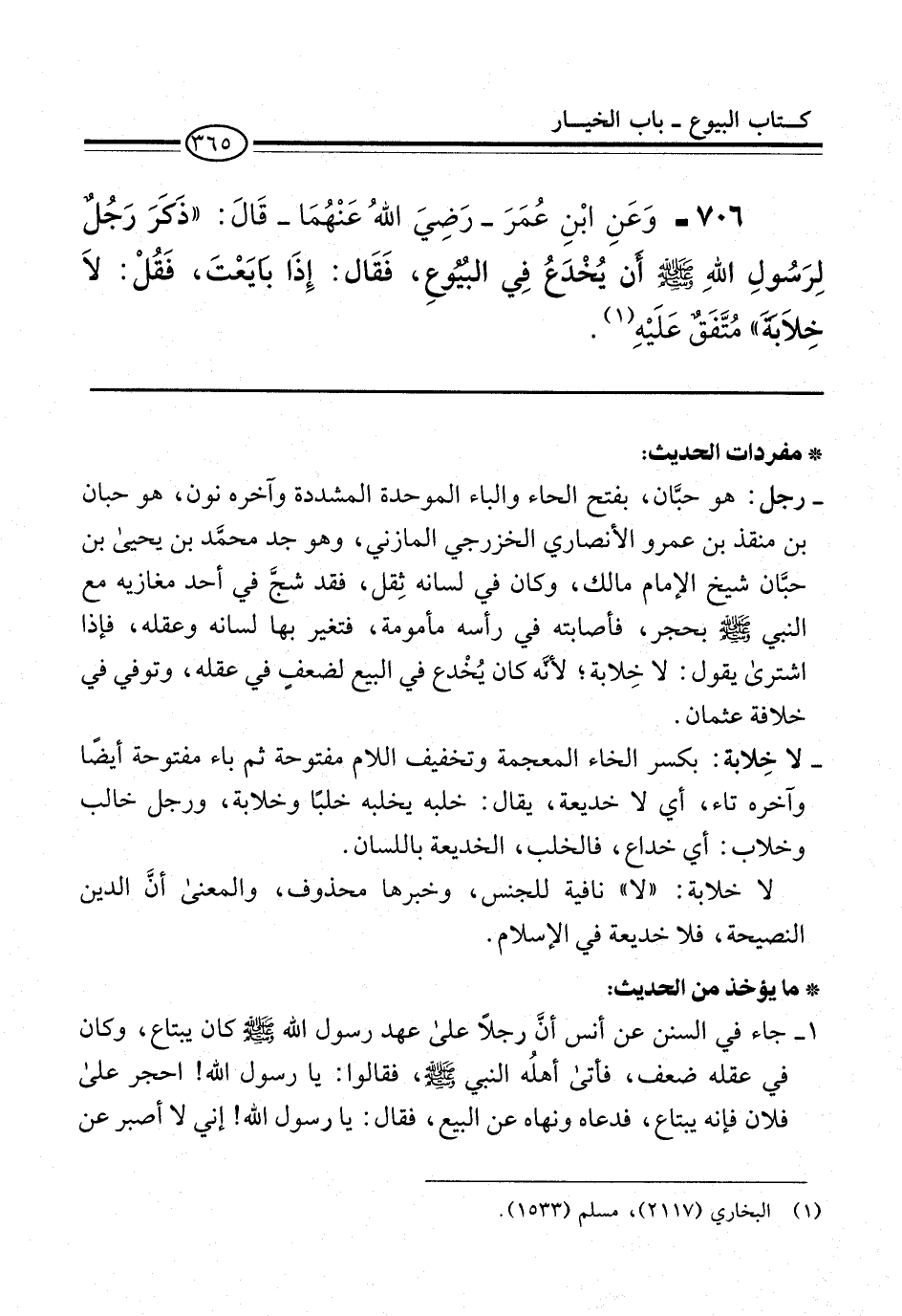706 - وَعَنِ ابْنِ عُمَرَ -رَضِيَ اللهُ عَنْهُمَا- قَالَ: "ذَكرَ رَجُلٌ لِرَسُولِ اللهِ -صلى الله عليه وسلم- أَن يُخْدَعُ فِي البُيُوعِ، فَقَال: إِذَا بَايَعْتَ، فَقُلْ: لاَ خِلاَبَةَ" مُتَّفَقٌ عَلَيْهِ (¬1).