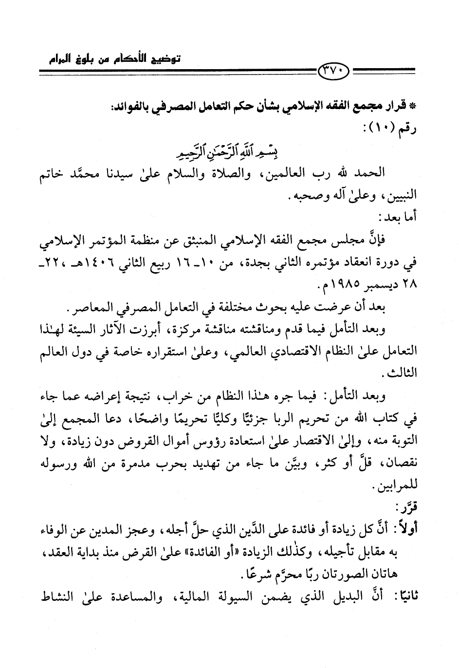* قرار مجمع الفقه الإسلامي بشأن حكم التعامل المصرفي بالفوائد: رقم (10):