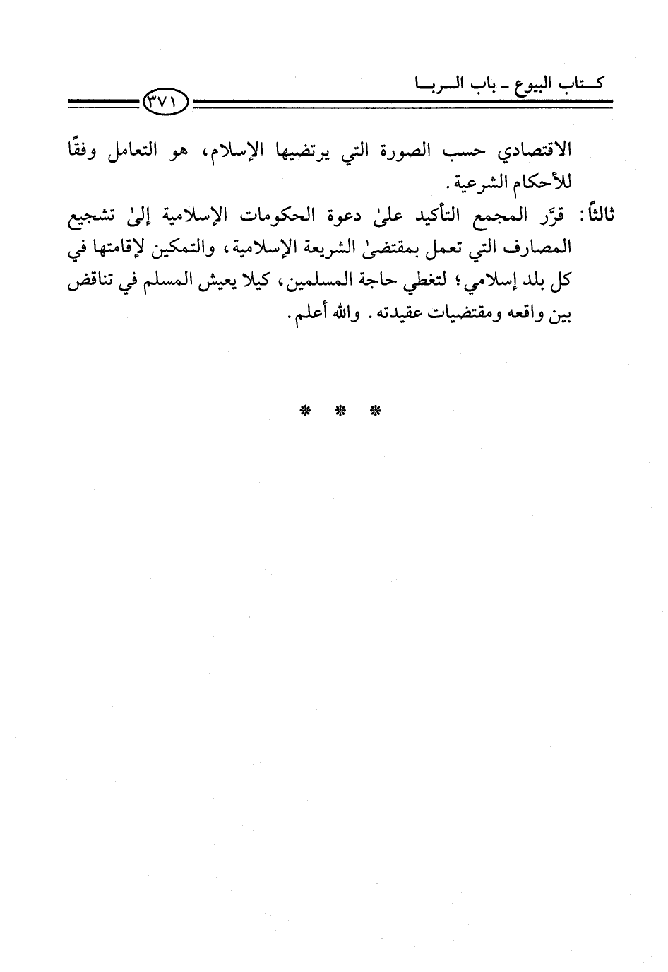 ثالثاً: قرَّر المجمع التأكيد على دعوة الحكومات الإسلامية إلى تشجيع المصارف التي تعمل بمقتضى الشريعة الإسلامية، والتمكين لإقامتها في كل بلد إسلامي؛ لتغطي حاجة المسلمين، كيلا يعيش المسلم في تناقض بين واقعه ومقتضيات عقيدته. والله أعلم.