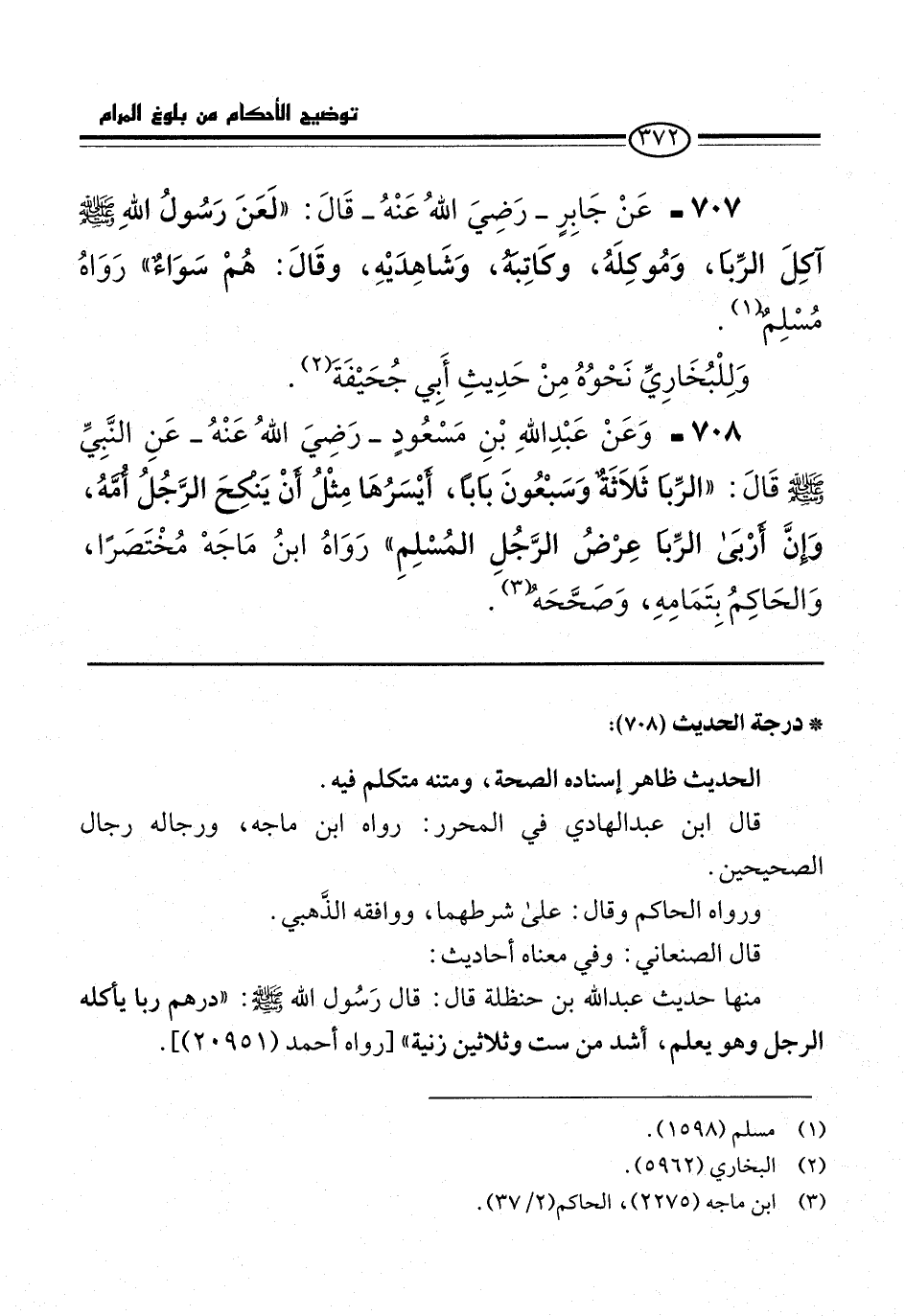 707 - عَنْ جَابِرٍ -رَضِيَ اللهُ عَنْهُ- قَالَ: "لَعَنَ رَسُولُ اللهِ -صلى الله عليه وسلم- آكِلَ الرِّبَا، وَمُوكلَهُ، وكَاتِبه، وَشَاهِدَيْهِ، وقَالَ: هُمْ سَوَاءٌ" رَوَاهُ مُسْلِمٌ (¬1).