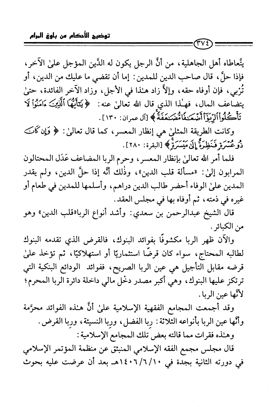 والآن ظهر الربا مكشوفًا بفوائد البنوك، فالقرض الذي تقدمه البنوك لطالبه المحتاج، سواء كان قرضًا استثماريًا أو استهلاكيًا، ثم تؤخذ على قرضه مقابل التأجيل هي عين الربا الصريح، ففوائد الودائع البنكية التي ترتكز عليها البنوك، وهي أكبر مصدر دخْل مالي داخلة دائرة الربا المحرم؛ لأنَّها عين الربا.