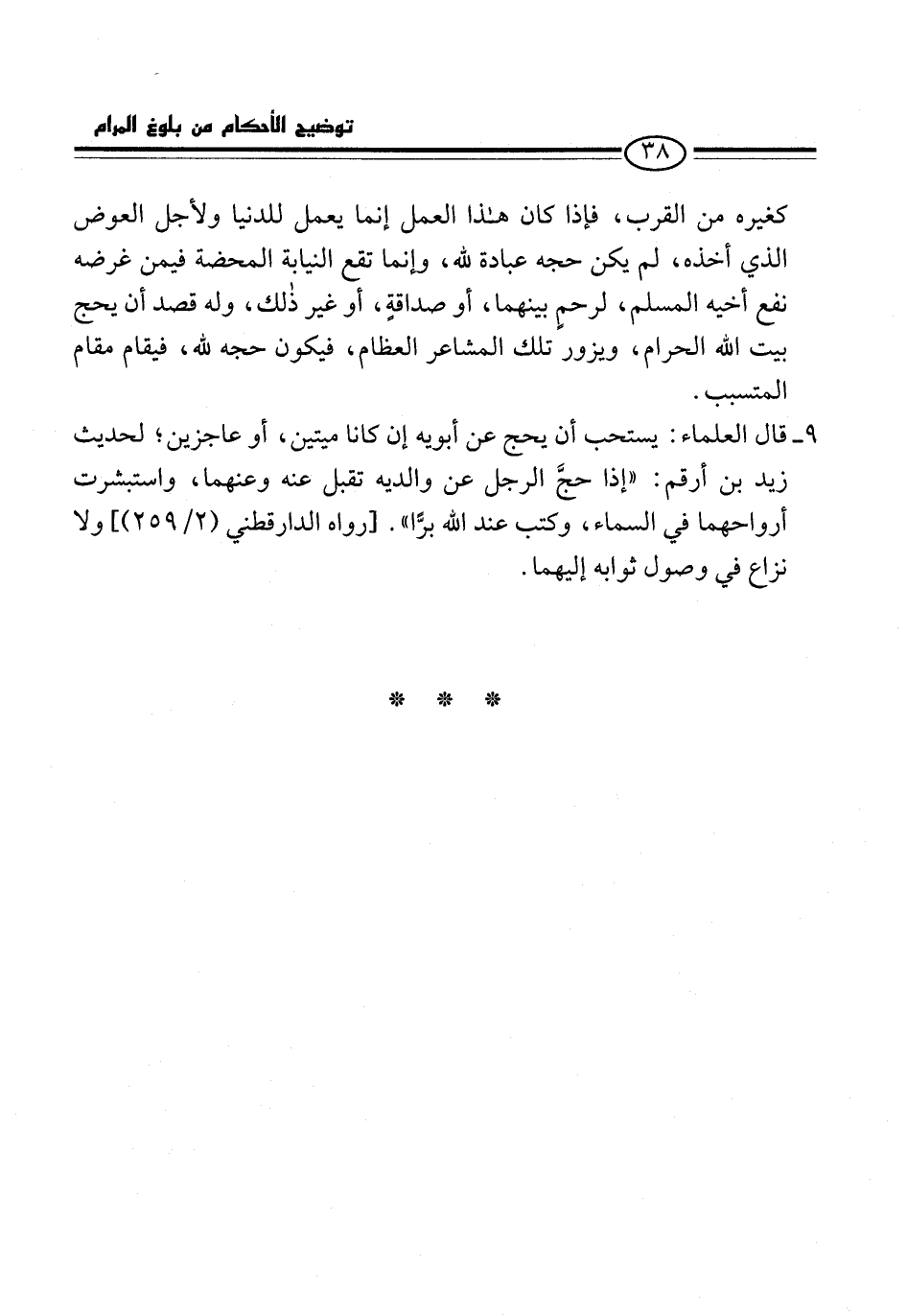 9 - قال العلماء: يستحب أن يحج عن أبويه إن كانا ميتين، أو عاجزين؛ لحديث زيد بن أرقم: "إذا حجَّ الرجل عن والديه تقبل عنه وعنهما، واستبشرت أرواحهما في السماء، وكتب عند الله برًّا". أرواه الدارقطني (2/ 259)، ولا نزاع في وصول ثوابه إليهما.