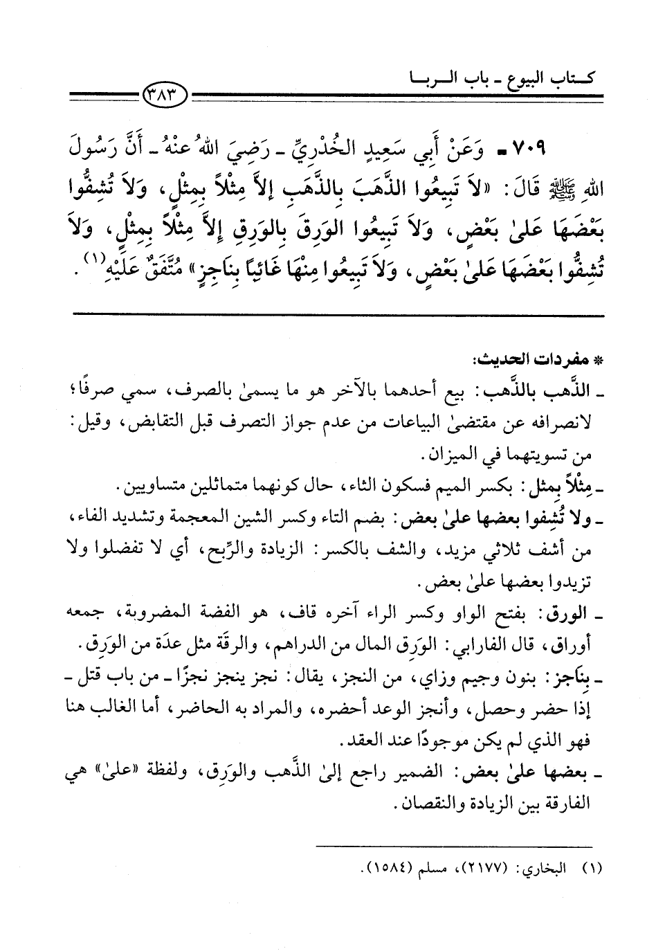 709 - وَعَنْ أَبِي سَعِيدٍ الخُدْرِيِّ -رَضِيَ اللهُ عنْهُ- أَنَّ رَسُولَ اللهِ -صلى الله عليه وسلم- قالَ: "لاَ تَبِيعُوا الذَّهَبَ بِالذَّهَبِ إلاَّ مِثْلاً بمِثْلٍ، وَلاَ تُشِفُّوا بَعْضَهَا عَلى بَعْضٍ، وَلاَ تَبِيعُوا الوَرِقَ بِالوَرِقِ إِلاَّ مِثْلاً بِمِثْلٍ، وَلاَ تُشِفُّوا بَعْضَهَا عَلى بَعْضٍ، وَلاَ تَبِيعُوا مِنْهَا غَائِباً بِناجِزٍ" مُتَّفَقٌ عَلَيْهِ (¬1).