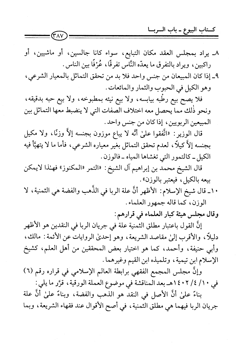10 - قال شيخ الإسلام: الأظهر أنَّ علة الربا في الذَّهب والفضة هي الثمنية، لا الوزن، كما قاله جمهور العلماء.