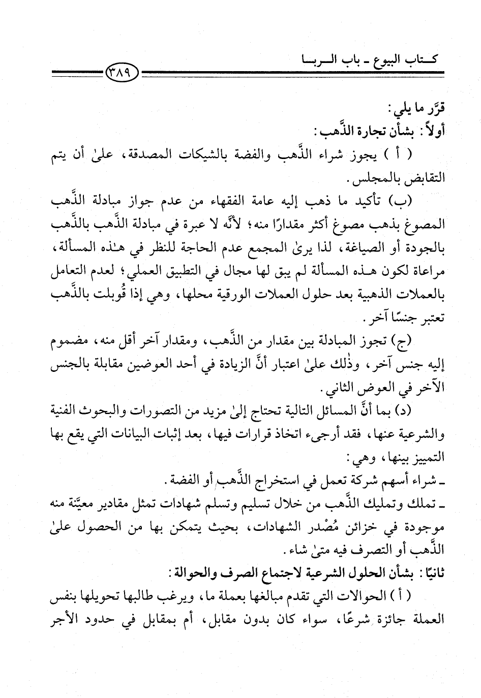 (ب) تأكيد ما ذهب إليه عامة الفقهاء من عدم جواز مبادلة الذَّهب المصوغ بذهب مصوغ أكثر مقدارًا منه؛ لأنَّه لا عبرة في مبادلة الذَّهب بالذَّهب بالجودة أو الصياغة، لذا يرى المجمع عدم الحاجة للنظر في هذه المسألة، مراعاة لكون هذه المسألة لم يبق لها مجال في التطبيق العملي؛ لعدم التعامل بالعملات الذهبية بعد حلول العملات الورقية محلها، وهي إذا قُوبلت بالذَّهب تعتبر جنسًا آخر.