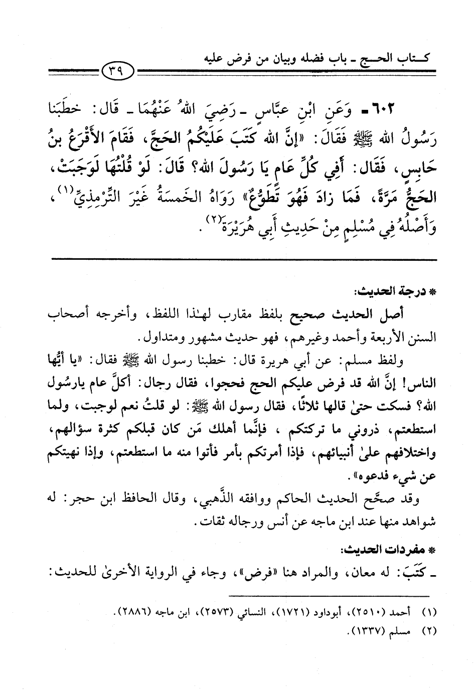 602 - وَعَنِ ابْنِ عبَّاسٍ -رَضِيَ اللهُ عَنْهُمَا- قَال: خطَبَنا رَسُولُ الله -صلى الله عليه وسلم- فقَالَ: "إنَّ الله كَتَبَ عَلَيْكُمُ الحَجَّ، فَقَامَ الأَقْرَعُ بنُ حَابسٍ، فَقَال: أَفِي كُلِّ عَامٍ يَا رَسُولَ الله؟ قَالَ: لَوْ قُلْتُهَا لَوَجَبَتْ، الحَجُّ مَرَّةً، فَمَا زادَ فَهُوَ تَطَوُّعٌ" رَوَاهُ الخَمسَةُ غَيْرَ التِّرْمِذِيِّ (¬1)، وَأَصْلُهُ فِي مُسْلِمٍ مِنْ حَدِيثِ أَبِي هُرَيْرَةَ (¬2).