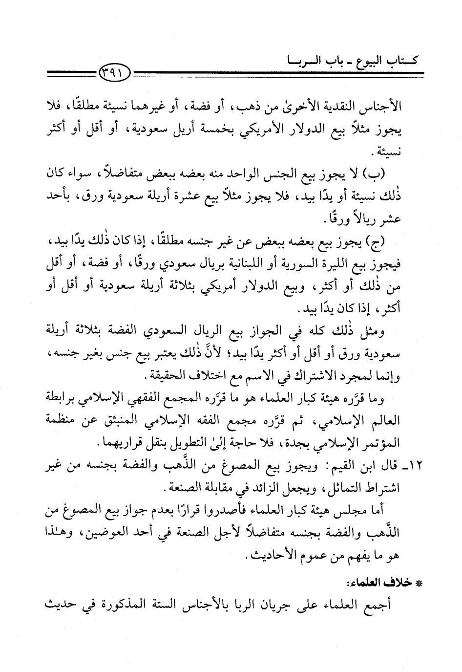 (ب) لا يجوز بيع الجنس الواحد منه بعضه ببعض متفاضلًا، سواء كان ذلك نسيئة أو يدًا بيد، فلا يجوز مثلًا بيع عشرة أريلة سعودية ورق، بأحد عشر ريالًا ورقًا.