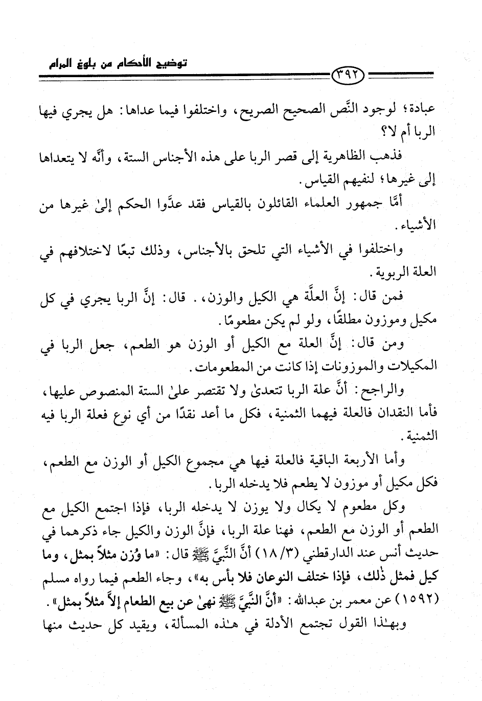 وكل مطعوم لا يكال ولا يوزن لا يدخله الربا، فإذا اجتمع الكيل مع الطعم أو الوزن مع الطعم، فهنا علة الربا، فإنَّ الوزن والكيل جاء ذكرهما في حديث أنس عند الدارقطني (3/ 18) أنَّ النَّبيَّ -صلى الله عليه وسلم- قال: "ما وُزن مثلًا بمثل، وما كيل فمثل ذلك، فإذا ختلف النوعان فلا بأس به"، وجاء الطعم فيما رواه مسلم (1592) عن معمر بن عبد الله: "أنَّ النَّبيَّ -صلى الله عليه وسلم- نهى عن بيع الطعام إلاَّ مثلًا بمثل".