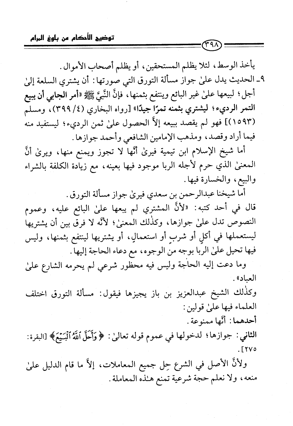 9 - الحديث يدل على جواز مسألة التورق التي صورتها: أن يشتري السلعة إلى أجل؛ لبيعها على غير البائع وينتفع بثمنها، فإنَّ النَّبيَّ -صلى الله عليه وسلم- "أمر الجابي أن يبيع التمر الرديء؛ ليشتري بثمنه تمرًا جيدًا" [رواه البخاري (4/ 399)، ومسلم (1593)] فهو لم يقصد ببيعه إلاَّ الحصول على ثمن الرديء؛ ليستفيد منه فيما أراد وقصد، ومذهب الإمامين الشافعي وأحمد جوازها.