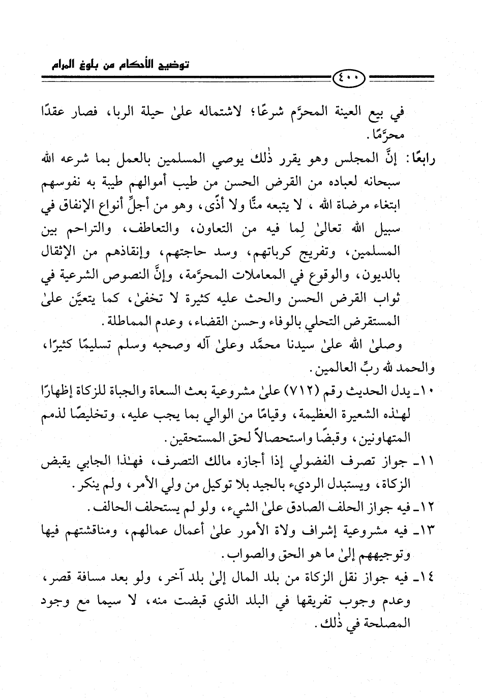 رابعًا: إنَّ المجلس وهو يقرر ذلك يوصي المسلمين بالعمل بما شرعه الله سبحانه لعباده من القرض الحسن من طيب أموالهم طيبة به نفوسهم ابتغاء مرضاة الله، لا يتبعه منًّا ولا أذًى، وهو من أجلِّ أنواع الإنفاق في سبيل الله تعالى لِما فيه من التعاون، والتعاطف، والتراحم بين المسلمين، وتفريج كرباتهم، وسد حاجتهم، وإنقاذهم من الإثقال بالديون، والوقوع في المعاملات المحرَّمة، وإنَّ النصوص الشرعية في ثواب القرض الحسن والحث عليه كثيرة لا تخفى، كما يتعيَّن على المستقرض التحلي بالوفاء وحسن القضاء، وعدم المماطلة.