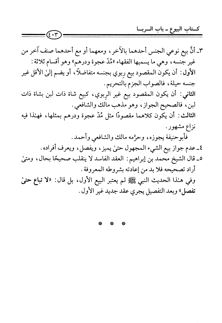3 - أنَّ بيع نوعي الجنس أحدهما بالآخر، ومعهما أو مع أحدهما صنف آخر من غير جنسه، وهي ما يسميها الفقهاء "مُدّ عجوة ودرهم" وهو أقسام ثلاثة: