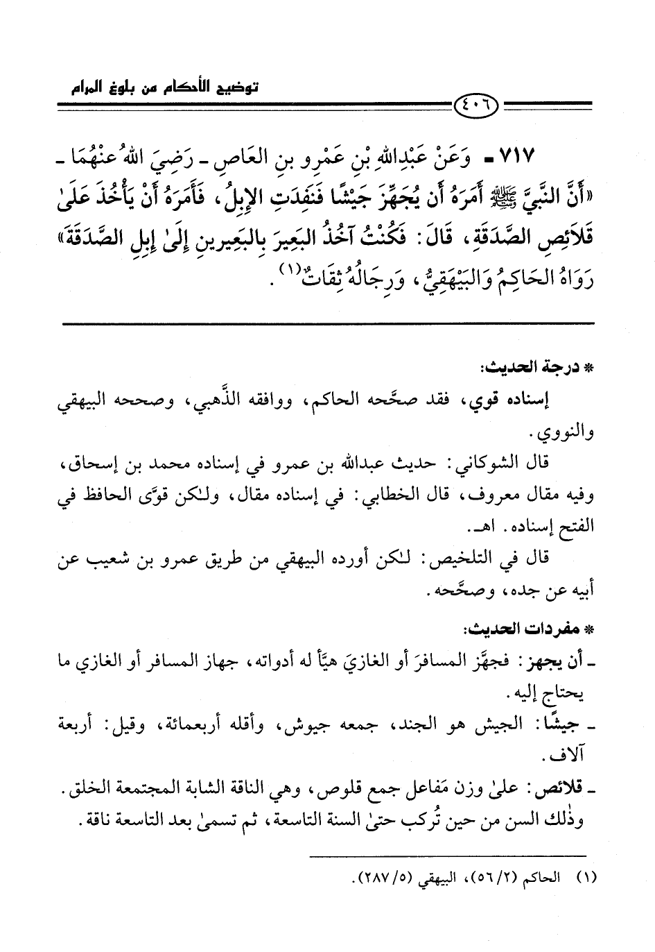717 - وَعَنْ عَبْدِ اللهِ بْنِ عَمْرِو بنِ العَاصِ -رَضِيَ اللهُ عنْهُمَا- "أنَّ النَّبِيَّ -صلى الله عليه وسلم- أمَرَهُ أَن يُجَهِّزَ جَيْشًا فَنَفِدَتِ الإِبِلُ، فَأَمَرَهُ أنْ يَأْخُذَ عَلَى قَلاَئِصِ الصَّدَقَةِ، قَالَ: فَكُنْتُ آخُذُ البَعِيرَ بِالبَعِيرينِ إِلَى إِبِلِ الصَّدَقَةَ" رَوَاهُ الحَاكِمُ وَالبَيْهَقِيُّ، وَرِجَالُهُ ثِقَاتٌ (¬1).
