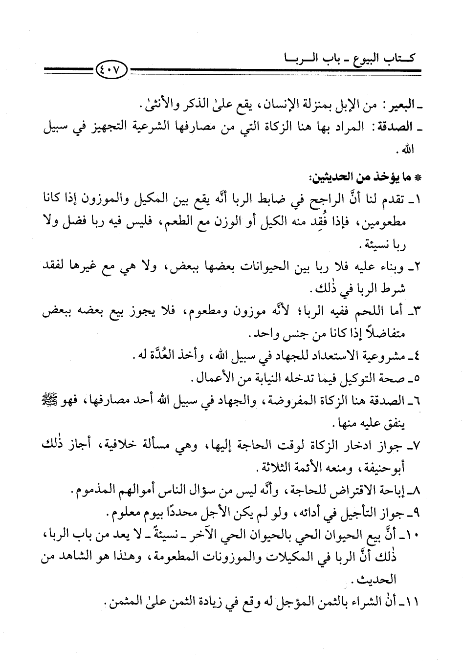 10 - أنَّ بيع الحيوان الحي بالحيوان الحي الآخر -نسيئةً- لا يعد من باب الربا، ذلك أنَّ الربا في المكيلات والموزونات المطعومة، وهذا هو الشاهد من الحديث.