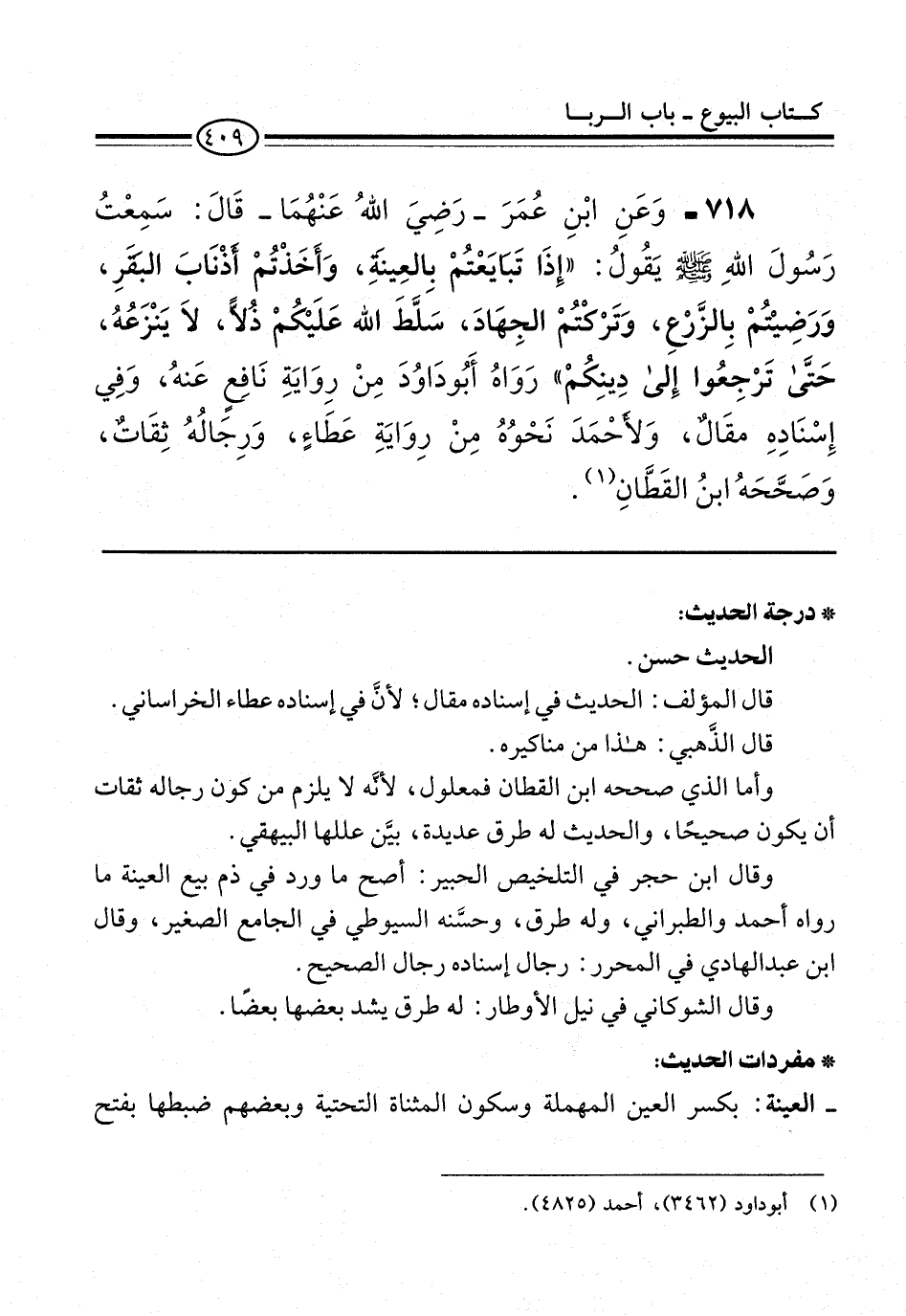 718 - وَعَنِ ابْنِ عُمَرَ -رَضِيَ اللهُ عَنْهُمَا- قَالَ: سَمِعْتُ رَسُولَ اللهِ -صلى الله عليه وسلم- يَقُولُ: "إِذَا تَبَايَعْتُمْ بِالعِينَةِ، وَأَخَذْتُمْ أذْنَابَ البَقَرِ، وَرَضِيْتُمْ بِالزَّرْعِ، وَتَرْكْتُمْ الجِهَادَ، سَلَّطَ الله عَلَيْكُمْ ذُلاًّ، لاَ يَنْزَعُهُ، حَتَّى تَرْجِعُوا إِلى دِينِكُمْ" رَوَاهُ أَبُو دَاوُدَ مِنْ رِوَايَةِ نَافِعٍ عَنهُ، وَفِي إِسْنَادهِ مقَالٌ، وَلأحْمَدَ نَحْوُهُ مِنْ رِوَايَةِ عَطَاءٍ، وَرِجَالُهُ ثِقَاتٌ، وَصَحَّحَهُ ابنُ القَطَّانِ (¬1).