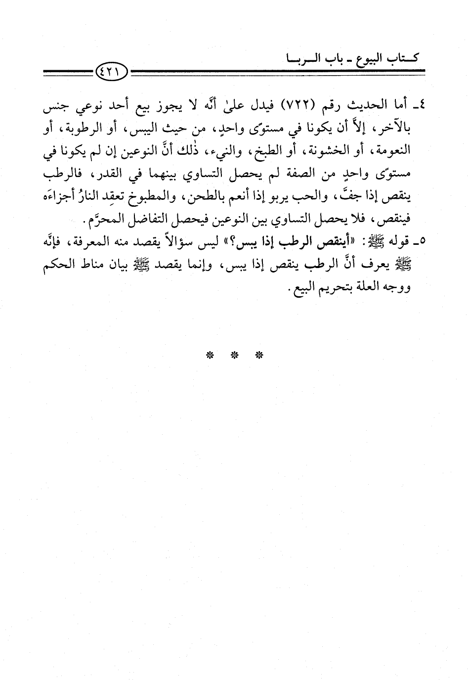 4 - أما الحديث رقم (722) فيدل على أنَّه لا يجوز بيع أحد نوعي جنس بالآخر، إلاَّ أن يكونا في مستوًى واحدٍ، من حيث اليبس، أو الرطوبة، أو النعومة، أو الخشونة، أو الطبخ، والنيء، ذلك أنَّ النوعين إن لم يكونا في مستوًى واحدٍ من الصفة لم يحصل التساوي بينهما في القدر، فالرطب ينقص إذا جفَّ، والحب يربو إذا أنعم بالطحن، والمطبوخ تعقِد النارُ أجزاءَه فينقص، فلا يحصل التساوي بين النوعين فيحصل التفاضل المحرَّم.