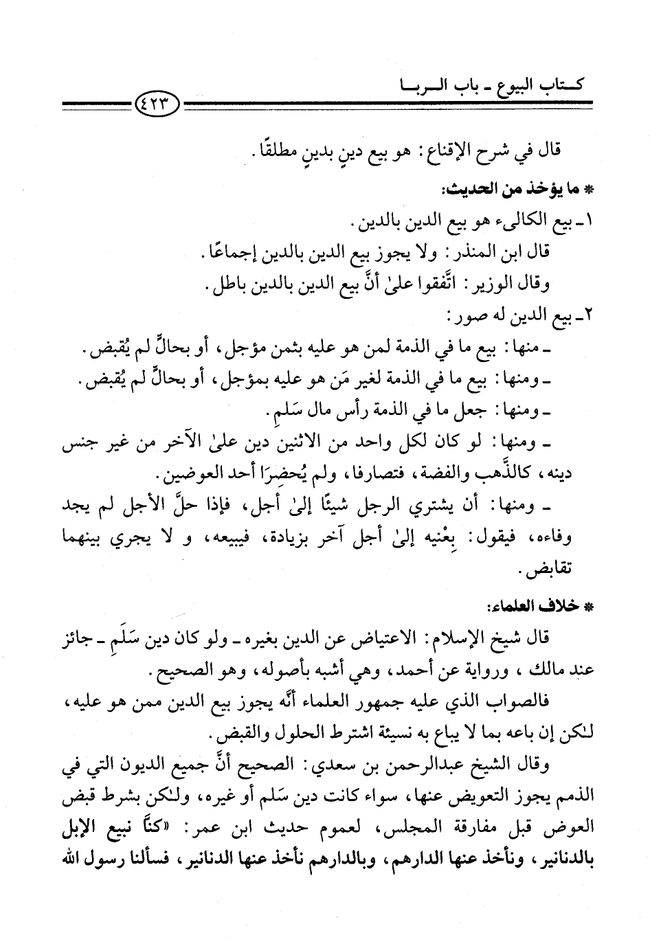 وقال الشيخ عبد الرحمن بن سعدي: الصحيح أنَّ جميع الديون التي في الذمم يجوز التعويض عنها، سواء كانت دين سَلم أو غيره، ولكن بشرط قبض العوض قبل مفارقة المجلس، لعموم حديث ابن عمر: "كنَّا نبيع الإبل بالدنانير، ونأخذ عنها الدارهم، وبالدارهم نأخذ عنها الدنانير، فسألنا رسول الله