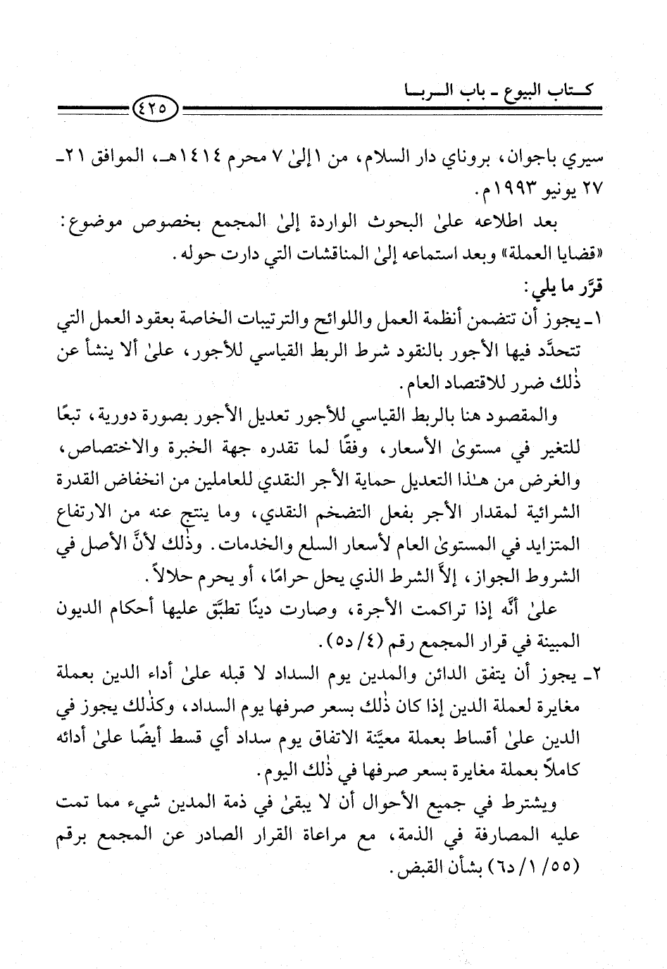 بعد اطلاعه على البحوث الواردة إلى المجمع بخصوص موضوع: "قضايا العملة" وبعد استماعه إلى المناقشات التي دارت حوله.
