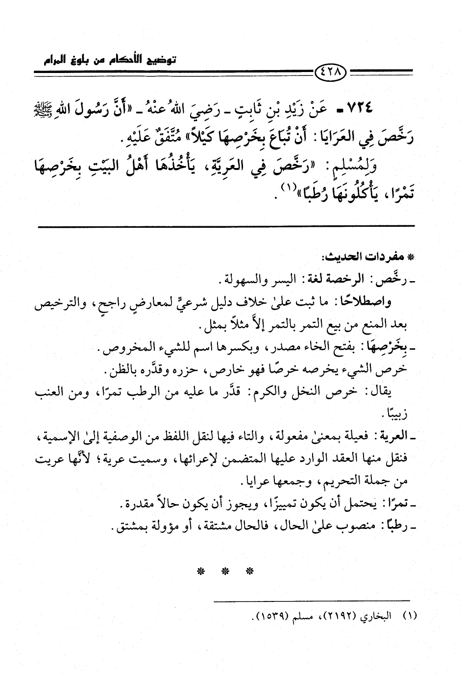 724 - عَنْ زَيْدِ بْنِ ثَابِتٍ -رَضِيَ اللهُ عنْهُ- "أَنَّ رَسُولَ اللهِ -صلى الله عليه وسلم- رَخَّصَ فِي العَرَايَا: أَنْ تُبَاعَ بِخَرْصِهَا كَيْلًا" مُتَّفَقٌ عَلَيْهِ.