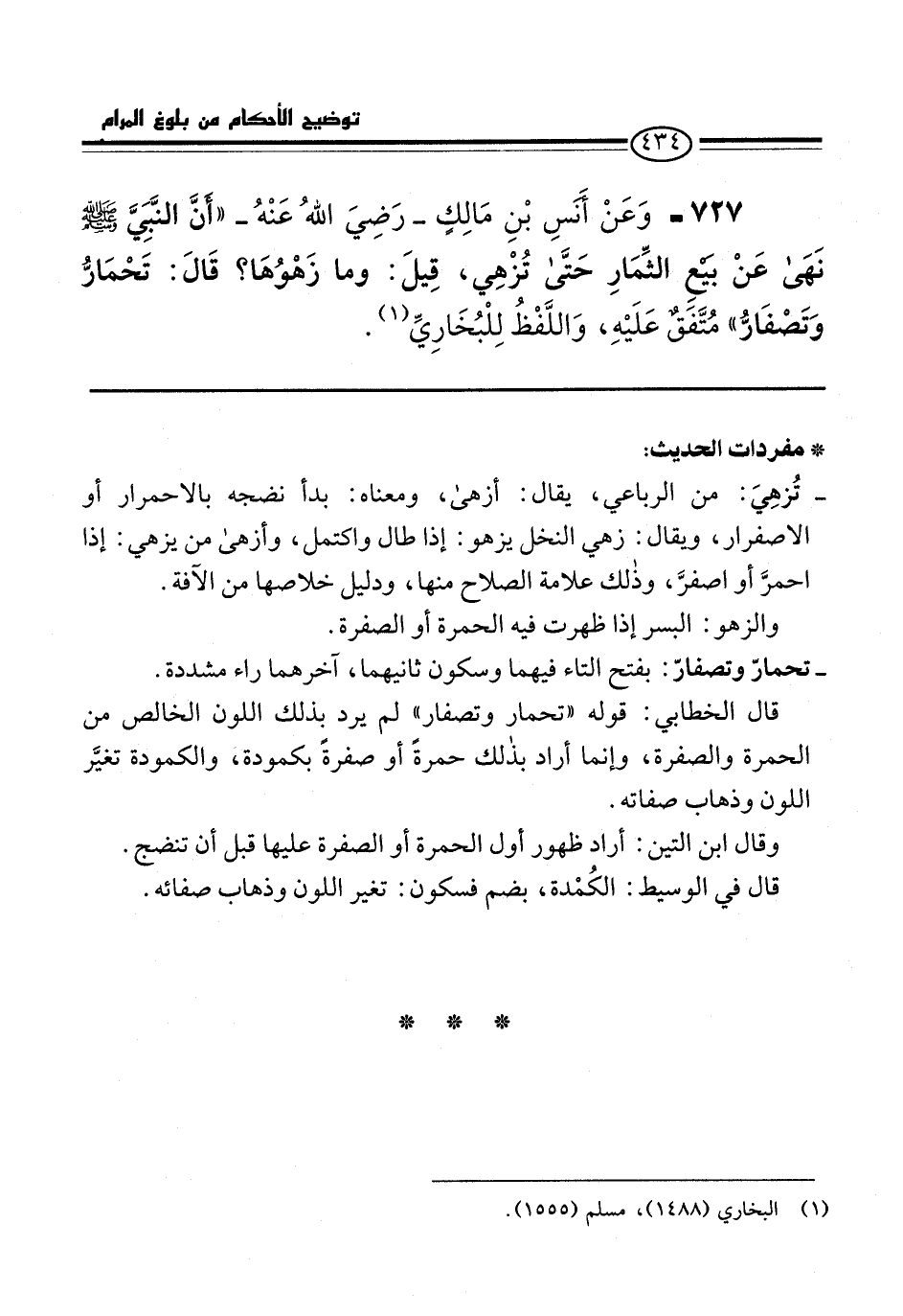 727 - وَعَنْ أَنَسِ بْنِ مَالِكٍ -رَضِيَ اللهُ عَنْهُ- "أَنَّ النَّبيَّ -صلى الله عليه وسلم- نَهَى عَنْ بيعٍ الثِّمَارِ حَتَّى تُزْهِي، قِيلَ: وما زَهْوُهَا؟ قَالَ: تَحْمَارُّ وَتَصْفَارُّ" مُتَّفقٌ عَلَيْهِ، وَاللَّفْظُ لِلْبُخَارِيِّ (¬1).