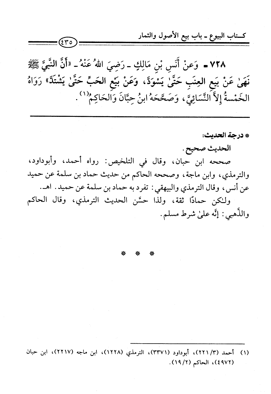 728 - وَعنْ أَنَسِ بْنِ مَالِكٍ -رَضِيَ اللهُ عَنْهُ- "أَنَّ النَّبِيَّ -صلى الله عليه وسلم- نَهَى عَنْ بَيعِ العِنَبِ حَتَّى يَسْوَدَّ، وَعَنْ بيعِ الحَبِّ حَتَّى يَشْتَدَّ" رَوَاهُ الخَمْسةُ إِلاَّ النَّسَائِيَّ، وَصَحَّحَهُ ابنُ حِبَّانَ وَالحَاكِمُ (¬1).