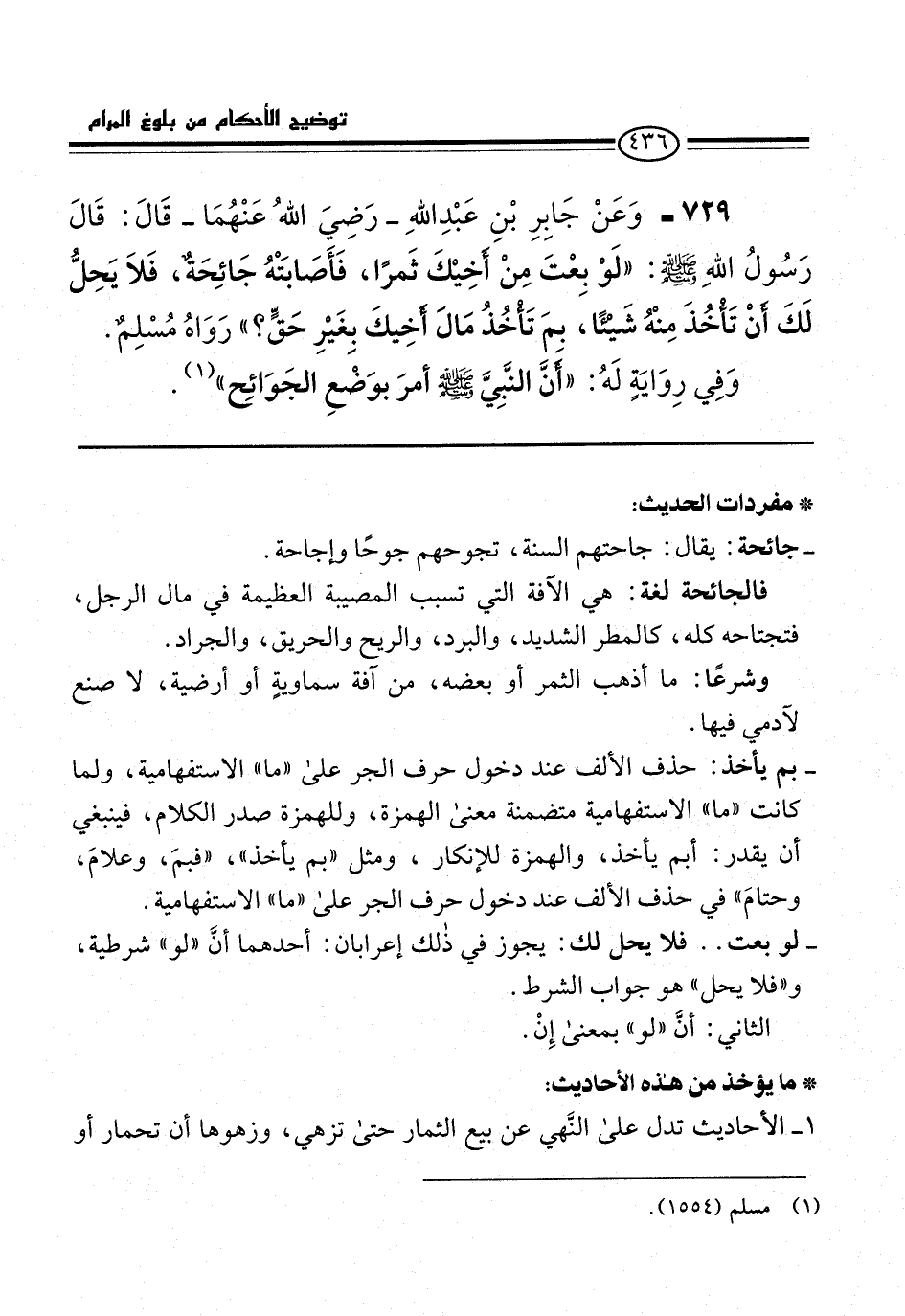 729 - وَعَنْ جَابِرِ بْنِ عَبْدِ اللهِ -رَضِيَ اللهُ عَنْهُمَا- قَالَ: قَالَ رَسُولُ اللهِ -صلى الله عليه وسلم-: "لَوْ بِعْتَ مِنْ أَخِيْكَ ثَمرًا، فَأَصَابتهُ جَائِحَةٌ، فَلاَ يَحِلُّ لَكَ أنْ تَأْخُذَ مِنْهُ شَيْئًا، بِمَ تَأْخُذُ مَالَ أَخِيكَ بِغَيْرِ حَقٍّ؟ " رَوَاهُ مُسْلِمٌ.