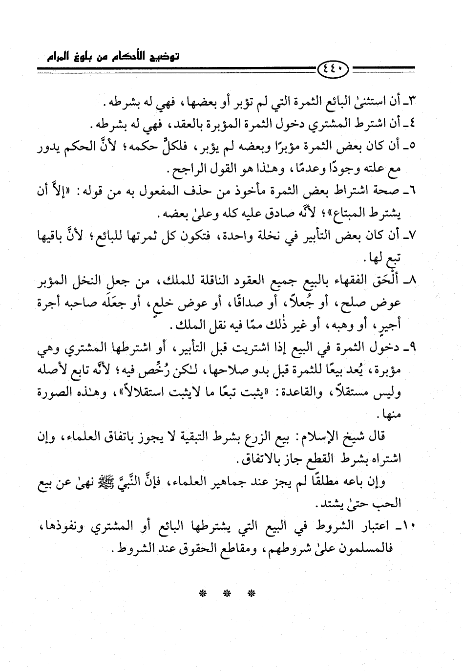 10 - اعتبار الشروط في البيع التي يشترطها البائع أو المشتري ونفوذها، فالمسلمون على شروطهم، ومقاطع الحقوق عند الشروط.