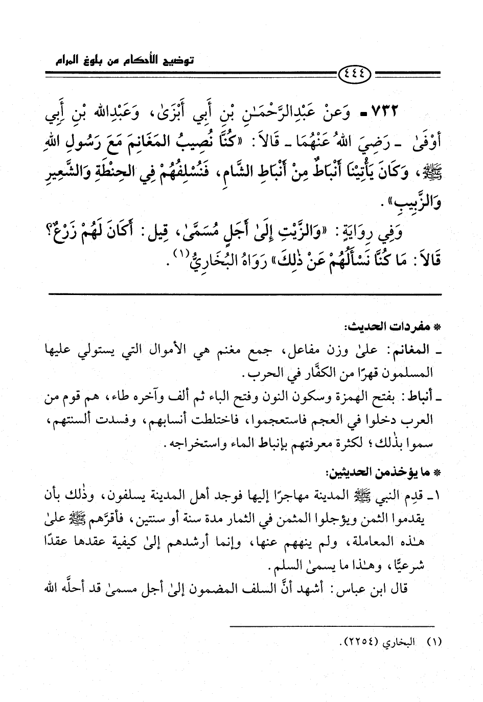 732 - وَعنْ عَبْدِ الرَّحْمَنِ بْنِ أَبِي أَبْزَى، وَعَبْدِ الله بْنِ أِبِي أوْفَى -رَضِيَ اللهُ عَنْهُمَا- قَالاَ: "كُنَّا نُصِيبُ المَغَانِمَ مَعَ رَسُولِ اللهِ -صلى الله عليه وسلم-، وَكانَ يَأتِيْنَا أنْبَاطٌ مِنْ أنْبَاطِ الشَّامِ، فَنُسْلِفُهُمْ فِي الحِنْطَةِ وَالشَّعِيرِ وَالزَّبِيبِ".