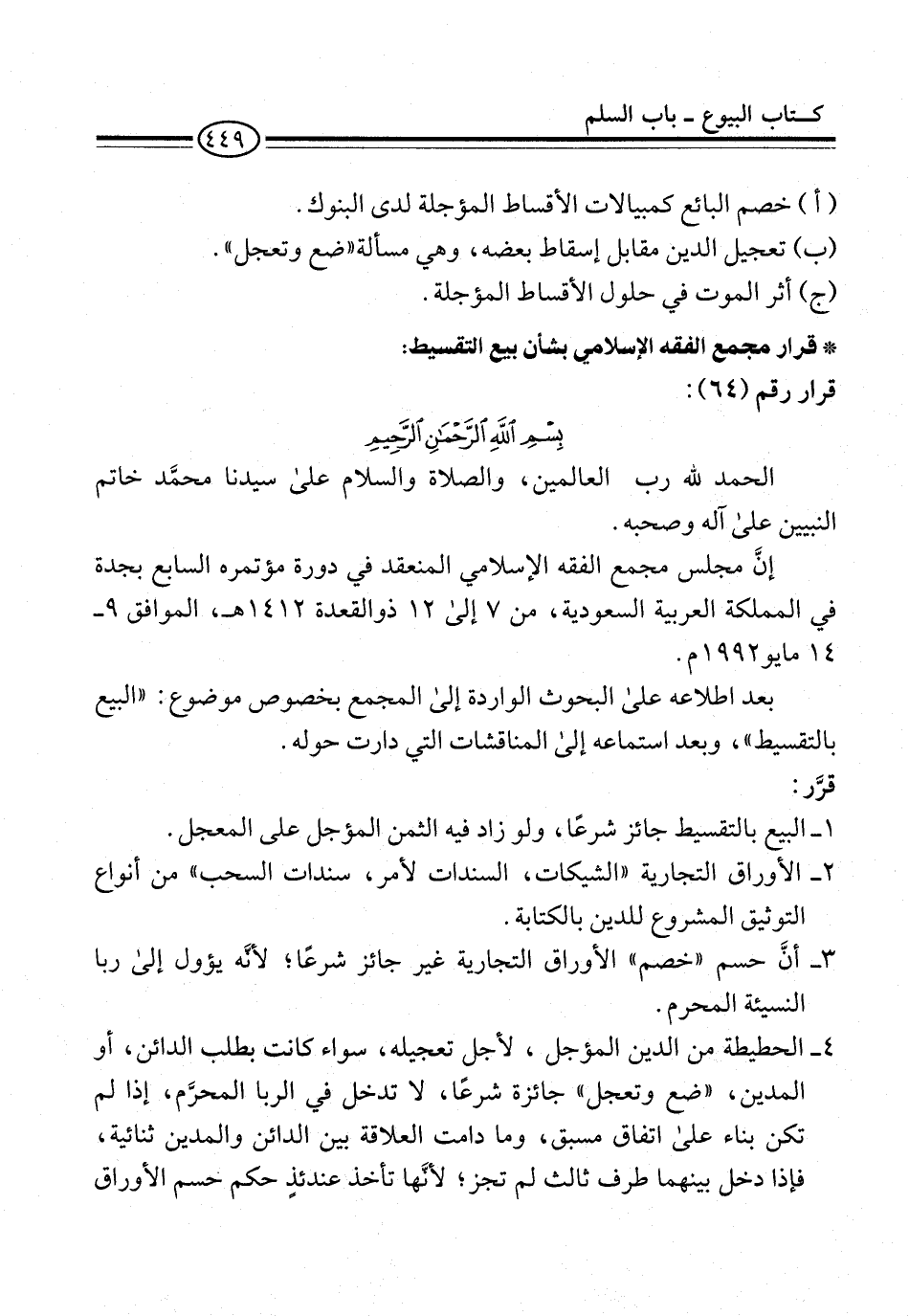 * قرار مجمع الفقه الإسلامي بشأن بيع التقسيط: قرار رقم (64):