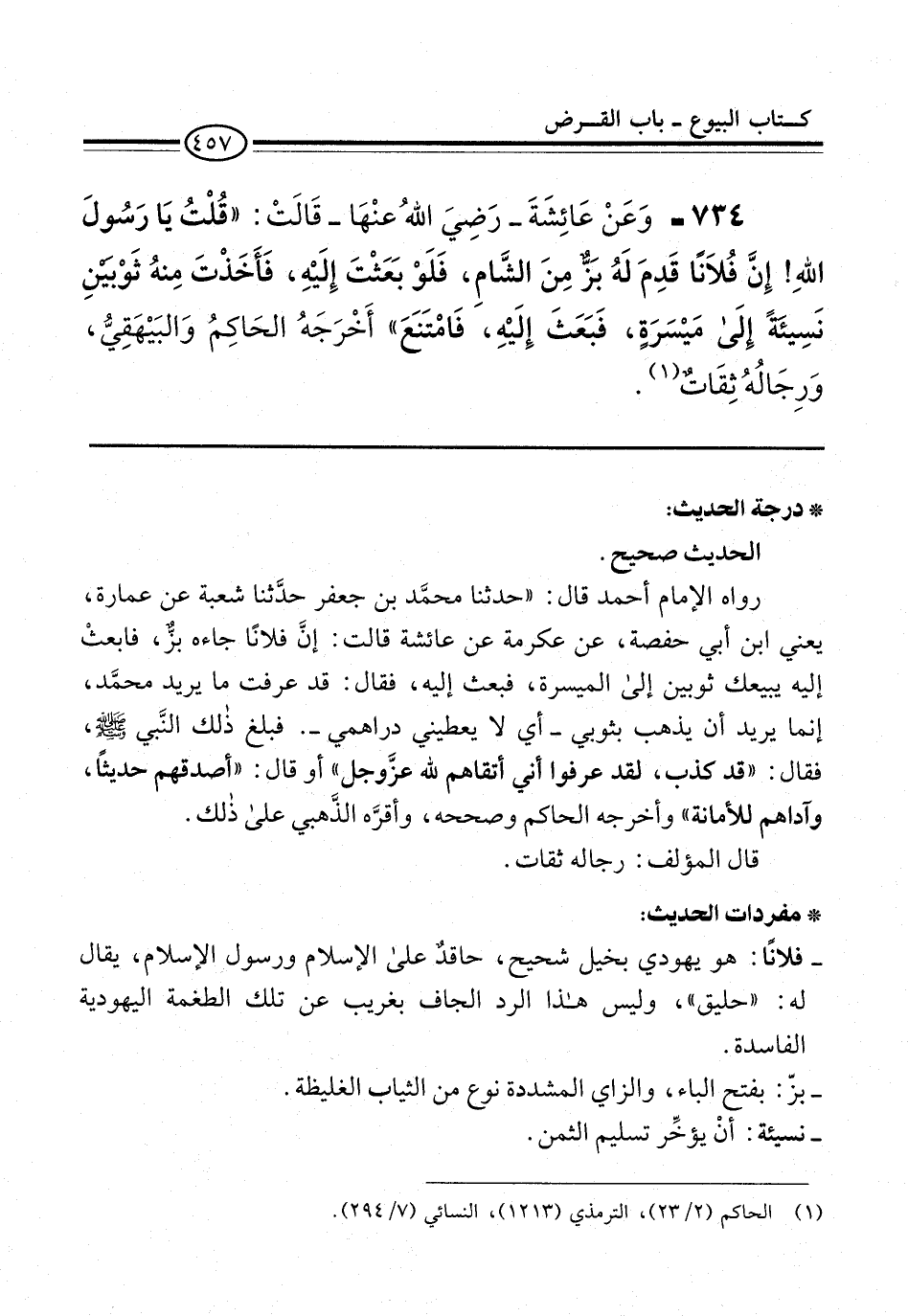 734 - وَعَنْ عَائِشَةَ -رَضِىَ اللهُ عنْهَا- قَالَتْ: "قُلْتُ يَا رَسُولَ اللهِ! إِنَّ فُلاَنًا قَدِمَ لَهُ بَزٌّ مِنَ الشَّامِ، فَلَوْ بَعَثْتَ إِلَيْهِ، فَأَخَذْتَ مِنهُ ثَوْبَيْنِ نَسِيئَةً إِلَى مَيْسَرَةٍ، فَبَعَثَ إِلَيْهِ، فَامْتَنَعَ" أَخْرَجَهُ الحَاكِمُ وَالبَيْهَقِيُّ، وَرِجَالُهُ ثِقَاتٌ (¬1).