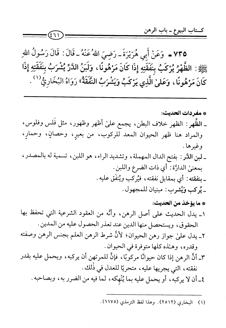 735 - وَعَنْ أَبِي هُرَيْرَةَ -رَضِيَ اللهُ عَنْهُ- قَالَ: قَالَ رَسُولُ اللهِ -صلى الله عليه وسلم-: الظَّهْرُ يُرْكَبُ بِنَفَقَتِهِ إِذَا كَانَ مَرْهُونًا، وَلَبَنُ الدَّرِّ يُشْرَبُ بِنَفَقَتِهِ إِذَا كَانَ مَرْهُونًا، وَعَلى الَّذِي يَرْكَبُ وَيَشْرَبُ النَّفَقَةُ" رَوَاهُ البُخَارِيُّ (¬1).