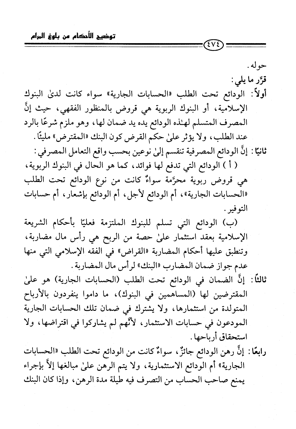 (أ) الودائع التي تدفع لها فوائد، كما هو الحال في البنوك الربوية، هي قروض ربوية محرَّمة سواءٌ كانت من نوع الودائع تحت الطلب "الحسابات الجارية"، أم الودائع لأجل، أم الودائع بإشعار، أم حسابات التوفير.