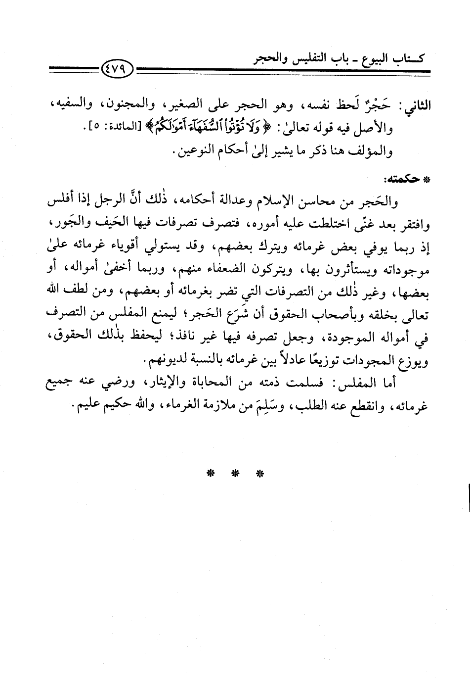 أما المفلس: فسلمت ذمته من المحاباة والإيثار، ورضي عنه جميع غرمائه، وانقطع عنه الطلب، وسَلِمَ من ملازمة الغرماء، والله حكيم عليم.