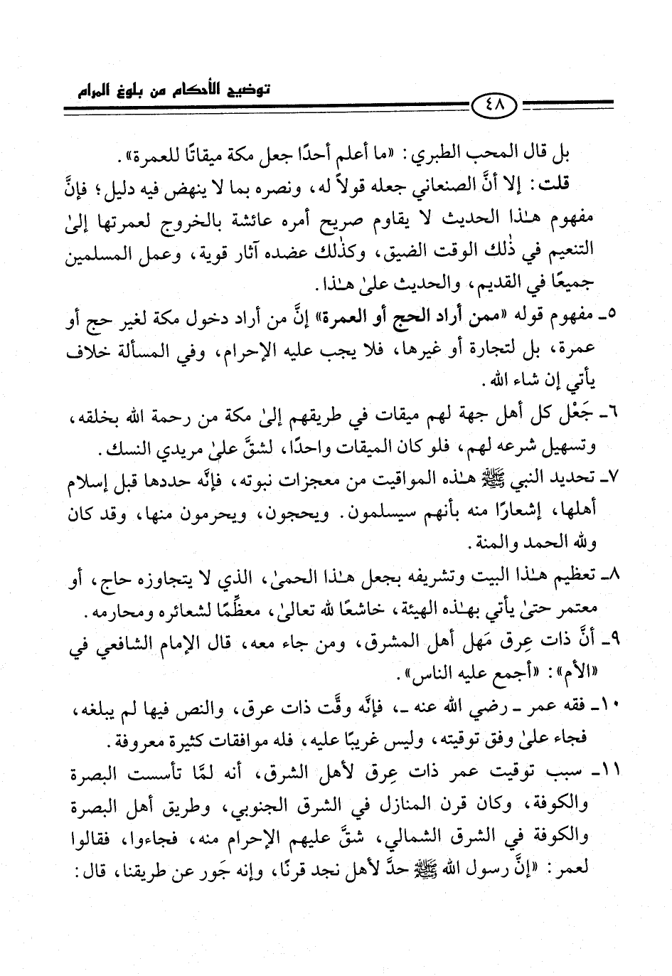 قلت: إِلا أنَّ الصنعاني جعله قولًا له، ونصره بما لا ينهض فيه دليل؛ فإنَّ مفهوم هذا الحديث لا يقاوم صريح أمره عائشة بالخروج لعمرتها إلى التنعيم في ذلك الوقت الضيق، وكذلك عضده آثار قوية، وعمل المسلمين جميعًا في القديم، والحديث على هذا.