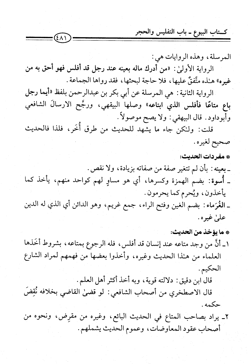 1 - أنَّ من وجد متاعه عند إنسان قد أفلس، فله الرجوع بمتاعه، بشروط أخَذها العلماء من هذا الحديث وغيره، وأخذوا بعضها من فهمهم لمراد الشارع الحكيم.