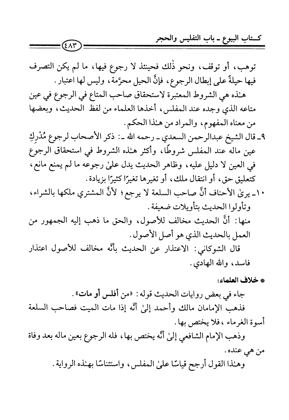 9 - قال الشيخ عبد الرحمن السعدي -رحمه الله-: ذكر الأصحاب لرجوع مُدْرِكِ عين ماله عند المفلس شروطًا، وأكثر هذه الشروط في استحقاق الرجوع في العين لا دليل عليه، وظاهر الحديث يدل على رجوعه ما لم يمنع مانع، كتعليق حق، أو انتقال ملك، أو تغيرها تغيرًا كثيرًا بزيادة.