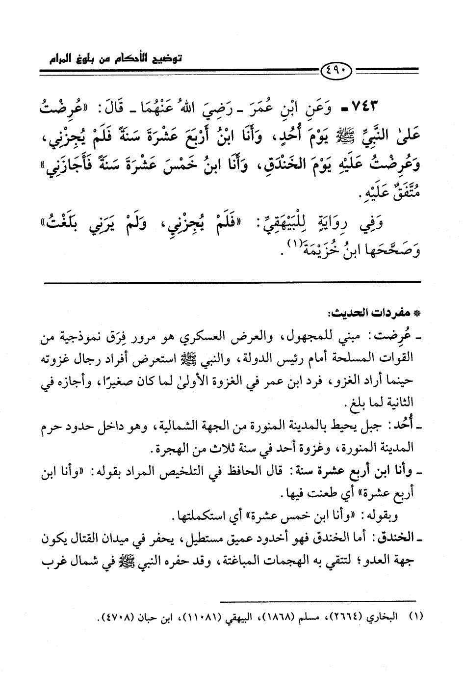 743 - وَعَنِ ابْنِ عُمَرَ -رَضِيَ اللهُ عَنْهُمَا- قَالَ: "عُرِضْتُ عَلى النَّبِيِّ -صلى الله عليه وسلم- يوْمَ أُحُدٍ، وَأنَا ابْنُ أرْبَعَ عَشْرَةَ سَنَةً فَلَمْ يُجِزْنِي، وَعُرِضْتُ عَلَيْهِ يَوْمَ الخَنْدَقِ، وَأنَا ابنُ خَمْسَ عَشْرَةَ سَنَةً فَأَجَازَنِي" مُتَّفَقٌ عَلَيْهِ.