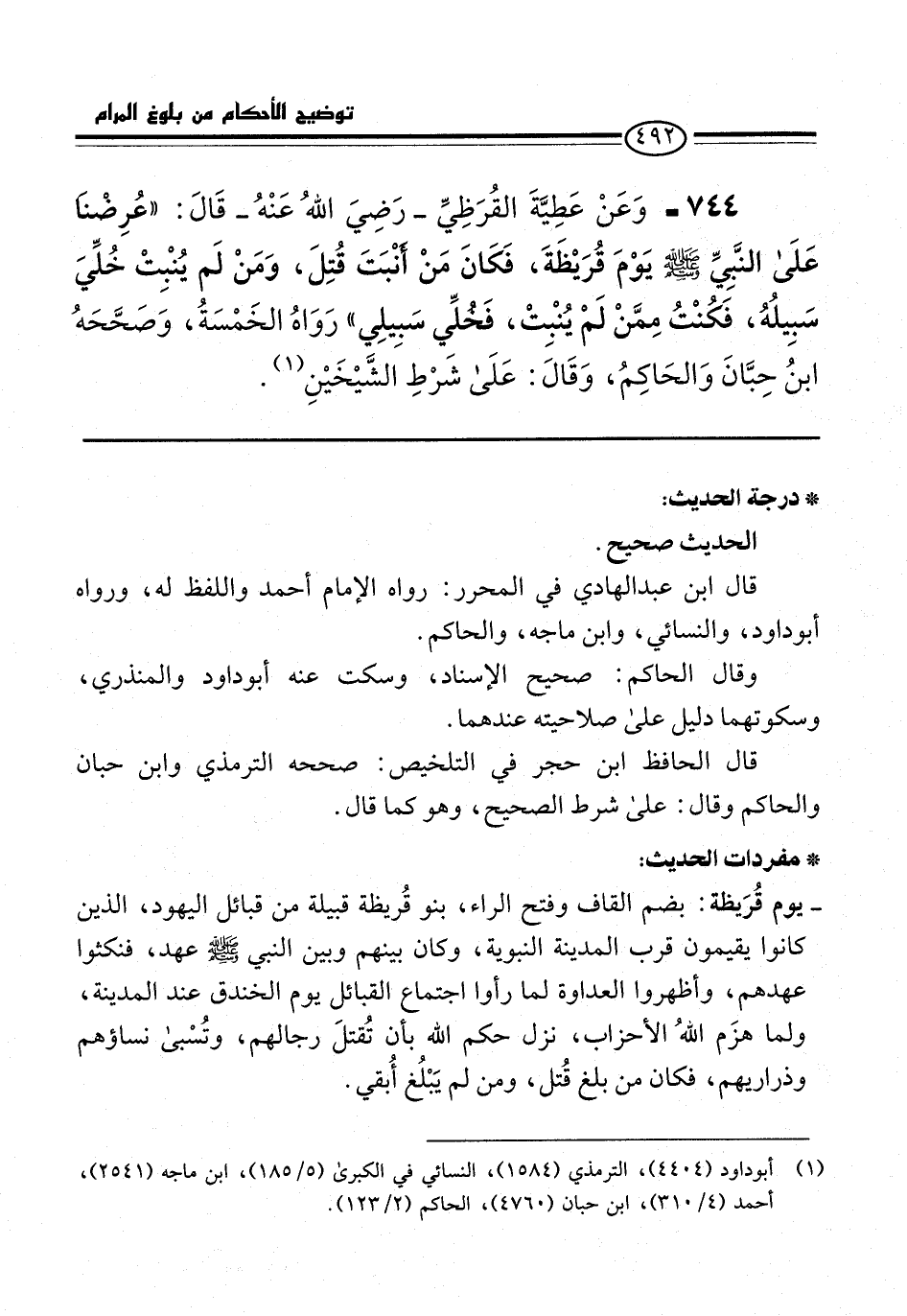 744 - وَعَنْ عَطِيَّةَ القُرَظِيِّ -رَضِيَ اللهُ عَنْهُ- قَالَ: "عُرِضْنَا عَلَى النَّبِيِّ -صلى الله عليه وسلم- يَوْمَ قُرَيْظَةَ، فَكَانَ مَنْ أَنْبَتَ قُتِلَ، وَمَنْ لَم يُنْبِتْ خُلِّيَ سَبِيلُهُ، فَكُنْتُ مِمَّنْ لَمْ يُنْبِتْ، فَخلِّي سَبِيلِي" رَوَاهُ الخَمْسَةُ، وَصَحَّحَهُ ابنُ حِبَّانَ وَالحَاكِمُ، وَقَالَ: عَلَى شَرْطِ الشَّيْخَيْنِ (¬1).