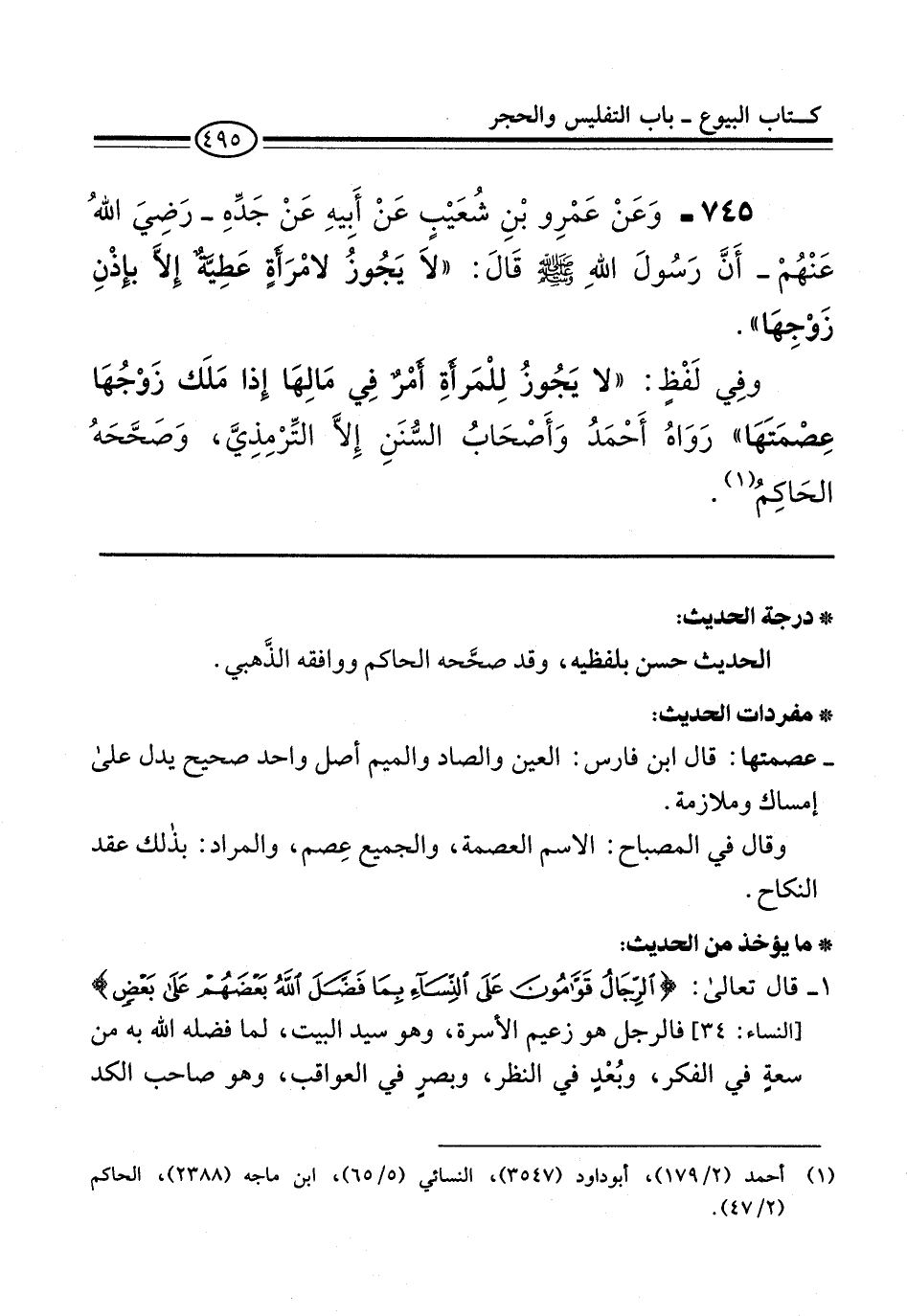 745 - وَعَنْ عَمْرِو بْنِ شُعَيْبٍ عَنْ أَبِيهِ عَنْ جَدِّهِ -رَضِيَ اللهُ عَنْهُمْ- أَنَّ رَسُولَ اللهِ -صلى الله عليه وسلم- قَالَ: "لاَ يَجُوزُ لامْرَأةٍ عَطِيَّةٌ إِلاَّ بإِذْنِ زَوْجِهَا".