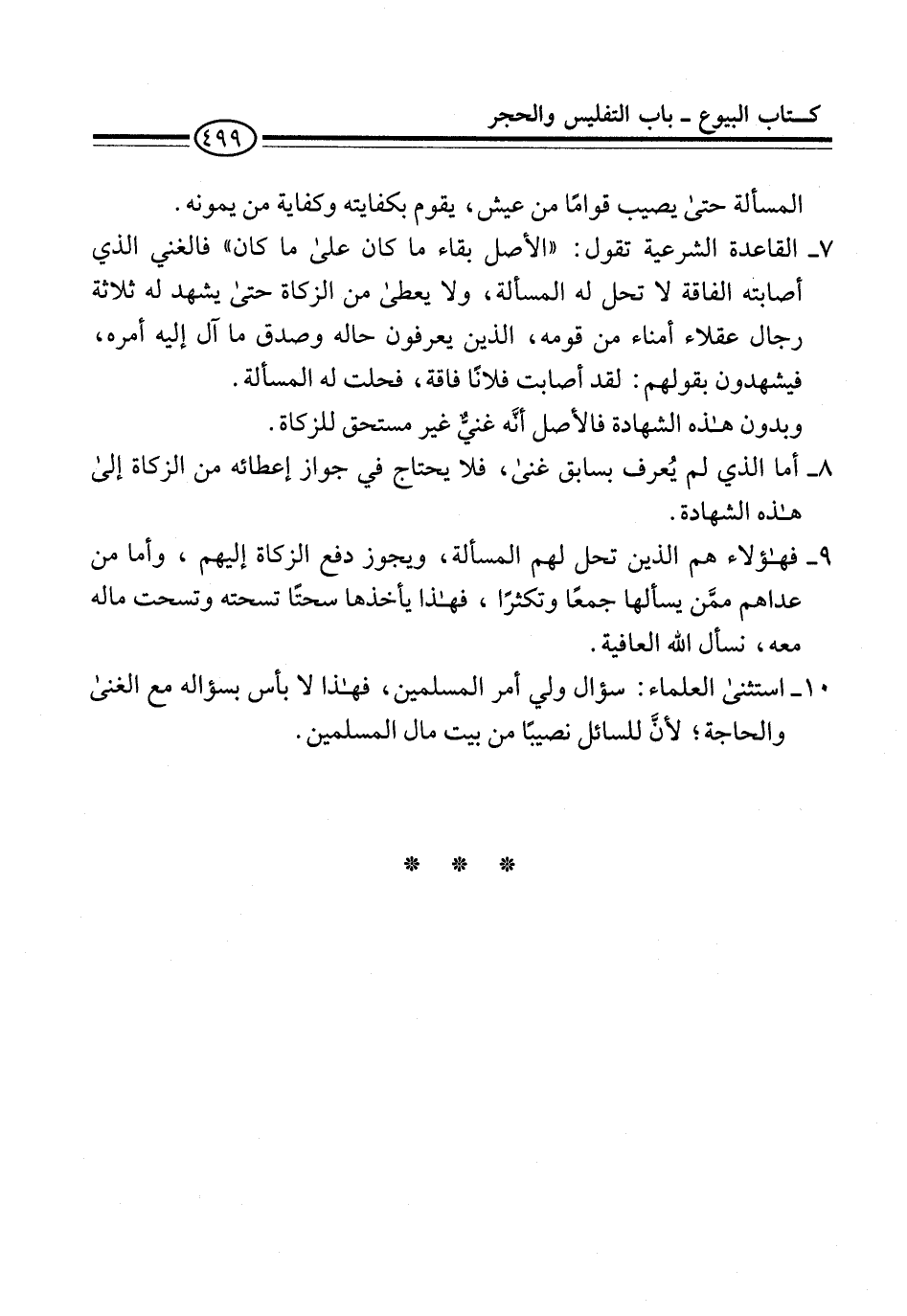 9 - فهؤلاء هم الذين تحل لهم المسألة، ويجوز دفع الزكاة إليهم، وأما من عداهم ممَّن يسألها جمعًا وتكثرًا، فهذا يأخذها سحتًا تسحته وتسحت ماله معه، نسأل الله العافية.