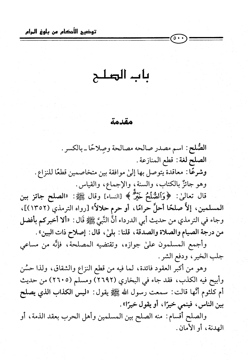 قال تعالي: {وَالصُّلْحُ خَيْرٌ} [النساء]، وقال -صلى الله عليه وسلم-:"الصلح جائز بين المسلمين، إلاَّ صلحًا أحلَّ حرامًا، أو حرم حلالاً" [رواه الترمذي (1352)]، وجاء في الترمذي من حديث أبي الدرداء أنَّ النَّبيَّ -صلى الله عليه وسلم- قَال: "ألا أخبركم بأفضل من درجة الصيام والصلاة والصدقة، قلنا: بلى، قال: إصلاح ذات البين".