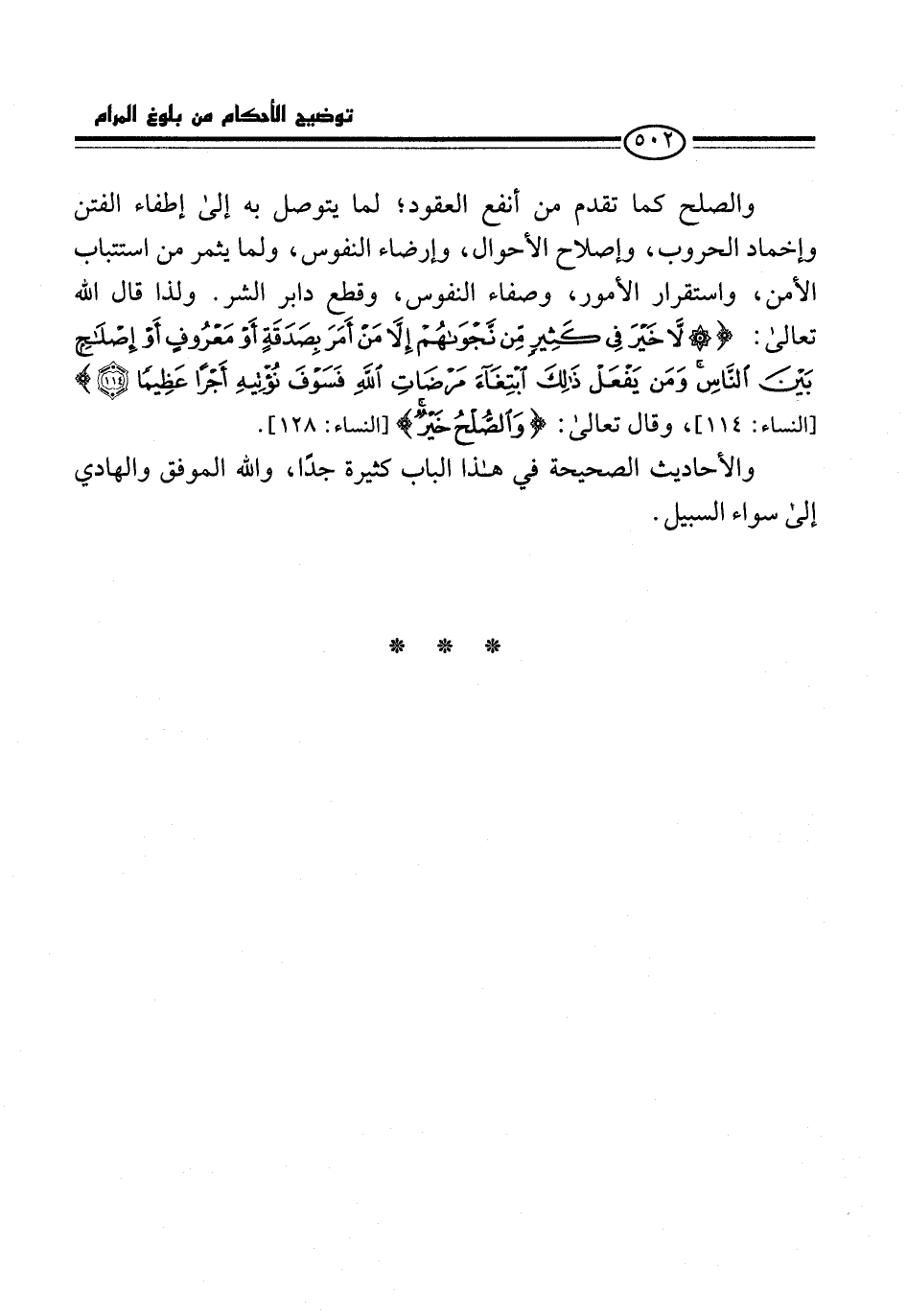 والصلح كما تقدم من أنفع العقود؛ لما يتوصل به إلى إطفاء الفتن وإخماد الحروب، وإصلاح الأحوال، وإرضاء النفوس، ولما يثمر من استتباب الأمن، واستقرار الأمور، وصفاء النفوس، وقطع دابر الشر. ولذا قال الله تعالى: {لَا خَيْرَ فِي كَثِيرٍ مِنْ نَجْوَاهُمْ إِلَّا مَنْ أَمَرَ بِصَدَقَةٍ أَوْ مَعْرُوفٍ أَوْ إِصْلَاحٍ بَيْنَ النَّاسِ وَمَنْ يَفْعَلْ ذَلِكَ ابْتِغَاءَ مَرْضَاتِ اللَّهِ فَسَوْفَ نُؤْتِيهِ أَجْرًا عَظِيمًا (114)} [النساء: 114]، وقال تعالى: {وَالصُّلْحُ خَيْرٌ} [النساء: 128].