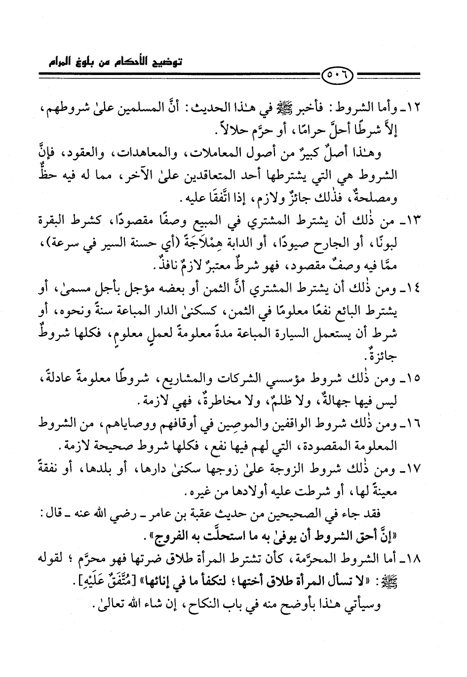 12 - وأما الشروط: فأخبر -صلى الله عليه وسلم- في هذا الحديث: أنَّ المسلمين على شروطهم، إلاَّ شرطًا أحلَّ حرامًا، أو حرَّم حلالاً.