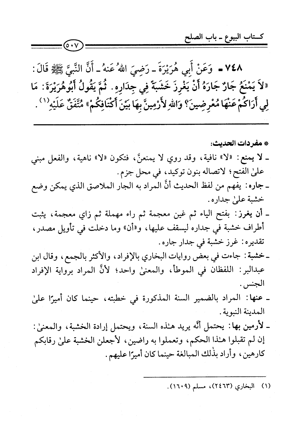 748 - وَعَنْ أَبِي هُرَيْرَةَ -رَضِيَ اللهُ عَنهُ- أَنَّ النَّبيَّ -صلى الله عليه وسلم- قَالَ: "لاَ يَمْنعُ جَارٌ جَارَهُ أنْ يَغْرِزَ خَشَبَةً فِي جِدَارِهِ. ثُمَّ يَقُولُ أبُو هُرَيْرَةَ: مَا لِي أرَاكُمْ عَنْهَا مُعْرِضِينَ؟ وَاللهِ لأَرْمِينَّ بِهَا بَيْنَ أكتَافِكُمْ" مُتَّفَقٌ عَلَيْهِ (¬1).