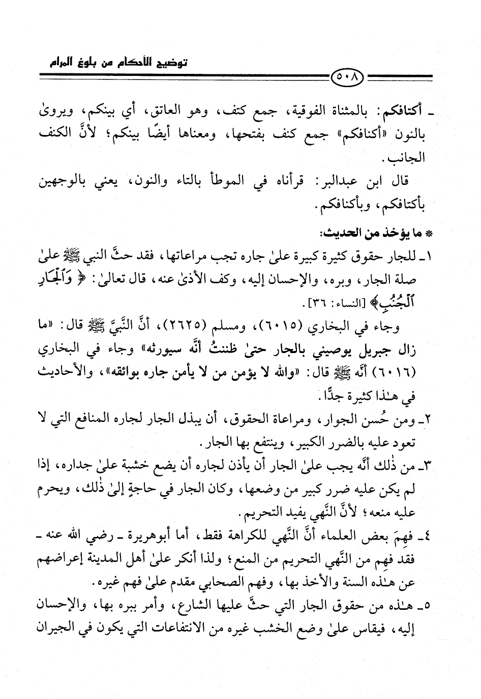 5 - هذه من حقوق الجار التي حثَّ عليها الشارع، وأمر ببره بها، والإحسان إليه، فيقاس على وضع الخشب غيره من الانتفاعات التي يكون في الجيران